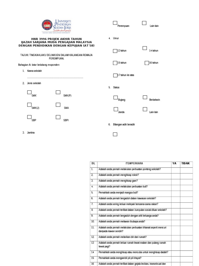 Read this essay on borang kaji selidik. Borang kaji selidik tanam semula peneroka. Borang kaji selidik tugasan pentaksiran tingkatan 3 geografi tajuk: Pilihan jawapan tu nadhie pilih 'multiple choice grid'. Dapatan kajiselidik ini akandigunakan untuk …