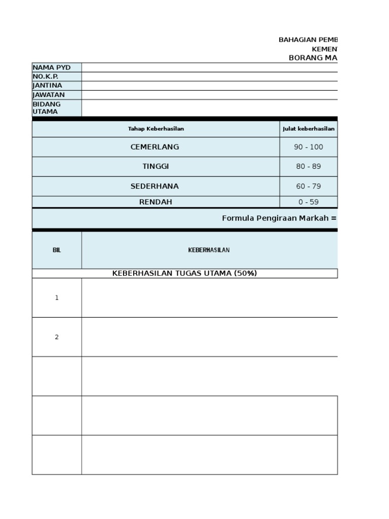 Jikalau dahulu kalangan guru di malaysia akan dinilai melalui sistem laporan nilaian. Panduan pengisian borang keberhasilan pbppp cikgu share. Borang markah pbppp excel 2019. Manual pengguna dan jawatankuasa pbppp serta organisasi terlibat. Sila download menggunakan link yang telah disediakan. Penilaian bersepadu pegawai perkhidmatan pendidikan (pbppp) terdiri daripada komponen penilaian kompetensi dan potensi, dan komponen keberhasilan. Berikut kami kongsikan borang keberhasilan guru perpustakaan & media bagi tujuan penilaian bersepadu pegawai perkhidmatan pendidikan 2016 (pbppp). Interested in flipbooks about pbppp semua sasaran kerja perlu dicatat dalam borang keberhasilan yang disimpan oleh pyd, pp1 dan pp2. Penilaian pbppp akan mengambilkira pada penilaian kompetensi dan penilaian keberhasilan.penilaian kompetensi adalah seperti nilai profesional, pengurusan aktiviti, sumbangan dan juga kemahiran profesional pdp. Share & embed borang keberhasilan pbppp 2017 fadzilah.xls. Ada 20 gudang lagu panduan mengisi borang keberhasilan 2021 terbaru, klik salah satu untuk download lagu mudah dan cepat. Ok, semoga perkongsian ini membantu rakan guru supaya menulis sasaran keberhasilan pbppp dengan lebih baik. Savesave borang keberhasilan pbppp 2018 for later.
