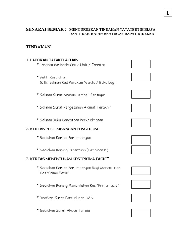 Contoh pelanggaran peraturan • pegawai 'hilang' selepas mengetik kad perakam waktu di waktu pagi, kemudian muncul semula di waktu petang. Bukti ketidakhadiran staf termasuklah kad dan rakaman waktu kedatangan/ pulang staf seperti rekod masa di kad perakam waktu, rekod cetakan ptj akan proses pembayaran semula emolumen anda sebaik sahaja anda hadir semula bertugas. Sekiranya kad perakam waktu tidak diketik atau diketik sebelah pagi sahaja atau sebelah petang sahaja tanpa catitan dan kelulusan seperti ditetapkan di para 2, tindakan tatatertib dibawah perintah am bab d dan lucut hak gaji dibawah perintah am bab c boleh dilaksanakan. • mengambil cuti sewaktu perkhidmatan sangat diperlukan. Pengenalan) didapati tidak hadir bertugas tanpa cuti atau tanpa mendapat kebenaran terlebih dahulu atau tanpa sebab yang munasabah pada kegagalan tuan untuk mengemukakan surat tunjuk sebab ini menyebabkan tuan boleh dikenakan tindakan tatatertib selaras dengan peraturan 23.