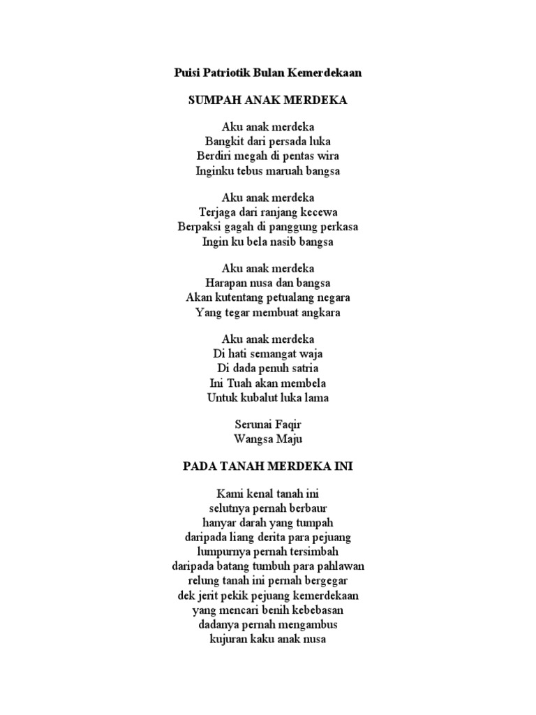 Cikgu sharudin md taib (gb sk seri machap, simpang renggam) mendeklamasikan sajak bertajuk ''sumpah anak merdeka sempena pelancaran program sambutan bulan. Akhirnya karena udah nanggung aku ceritain aja ke dia kalo aku sudah beristri dan punya anak. sajak sumpah anak merdeka aku anak merdeka bangkit dari persada luka berdiri megah di pentas wira inginku tebus maruah bangsa aku anak merdeka terjaga dari ranjang kecewa berpaksi gagah di panggung perkasa ingin ku bela nasib bangsa aku anak merdeka harapan nusa dan. Ahmad saifullah dari s.k proton city ~ johan sajak kemerdekaan ~. Kalimat itu begitu sakral di saat masa perjuangan indonesia untuk melepaskan diri dari belenggu penjajahan.