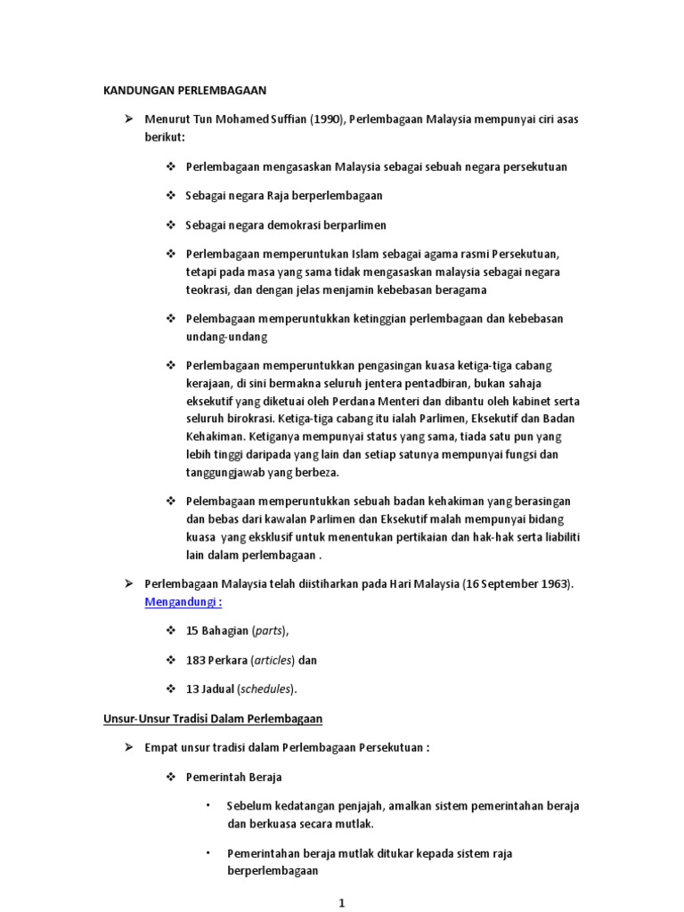 Abdullah, mohamad ainuddin iskandar lee (2004) perlembagaan malaysia. Unsur unsur tradisi dalam perlembagaan malaysia sebelum perlembagaan persekutuan digubal tanah melayu semasa penjajahan british pada masa itu telahpun mempunyai perlembagaannya. Unsur unsur tradisi dalam perlembagaan persekutuan. A) bahasa melayu sebagai bahasa kebangsaan b). Kebanyakan negara di dunia mempunyai perlembagaan dalam bentuk bertulis kecuali united kingdom, israel dan new zealand.