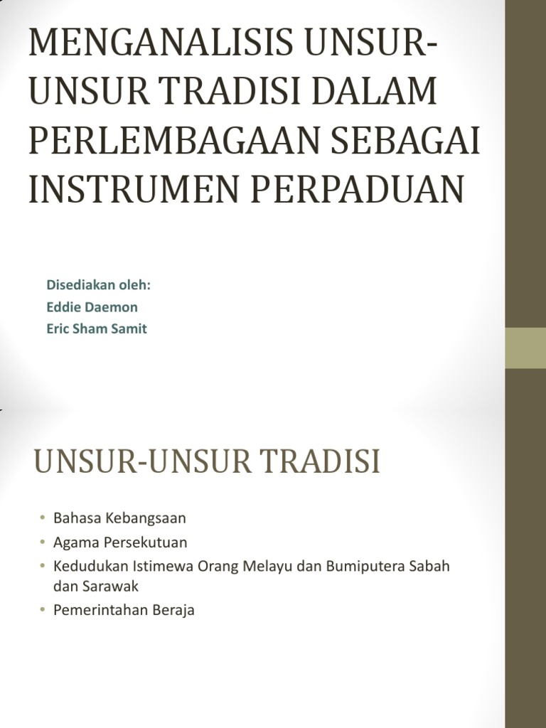 Hemananthini a/p krishnan pismp sem 3 unit bm pengenalan unsur tradisi telah wujud ratusan tahun sebelum perlembagaan diwujudkan pada tahung 1957 satu kontrak sosial semasa penggubalan perlembagaan yang meliputi: Perlembagaan tersebut digubal berikutan penubuhan malaysan union 1946. Abdullah, mohamad ainuddin iskandar lee (2004) perlembagaan malaysia. Unsur tradisi yang pertama ialah agama islam kerana telah termaktub dalam perkara 3 (1) perlembagaan persekutuan apabila dikatakan bahawa agama islam sebagai agama rasmi persekutuan tetapi memberi kebebasan agama lain berkembang kecuali kepada orang islam maka jelaslah agama islam salah satu unsur tradisi dalam perlembagaan persekutuan. Tiang seri hubungan etnik sejarah penggubalan perlembagaan persekutuan unsur unsur. Namun pada amnya, tradisi bermakna pemindahan dan kesinambungan daripada satu generasi kepada generasi yang lain. Kesan peninggalan inggeris di tanah melayu, antaranya ialah perlembagaan. A) bahasa melayu sebagai bahasa kebangsaan b). Unsur unsur tradisi sebenarnya telah wujud sejak ratusan tahun yang lalu sebelum pembentukan perlembagaan pada tahun 1957. Unsur tradisi yang pertama adalah kedudukan istimewa orang melayu telah termaktub dalam perkara 153 perlembagaan persekutuan. Perkataan tradisi mempunyai pelbagai makna. Kebanyakan negara di dunia mempunyai perlembagaan dalam bentuk bertulis kecuali united kingdom, israel dan new zealand. Perlu kerana telah wujud ratusan tahun sebelum perlembagaan persekutuan 1957.